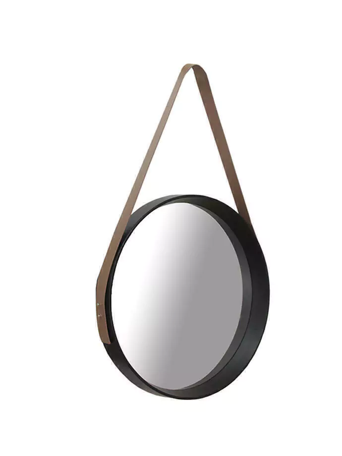 Espejo circular, blanco o negro, 52cm de diametro, con tira de ecocuero para colgar.