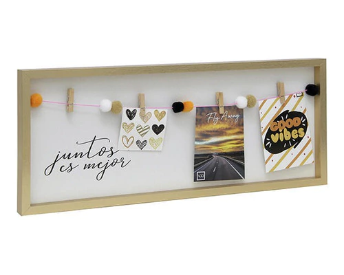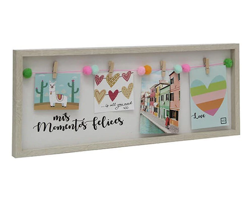 Marco con 4 broches. 8 pompones para colgar lo que quieras. Admite fotos distintos tamaños.